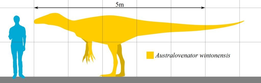 El Australovenator era un terópodo de tamaño medio, con una longitud aproximada de 6 metros y una altura en la cadera cercana a los 2 metros. Su peso se estimaba entre 500 y 600 kilogramos, lo que lo convertía en un depredador ágil en comparación con otros carnívoros más pesados.